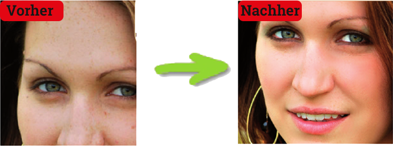 Sie wählen das Werkzeug zum Beseitigen der Hautunreinheiten an, bewegen den Mauszeiger auf die betreffenden Stellen und das Programm übermalt die Flecken automatisch mit dem jeweiligen Haut-Ton. Das war es schon!