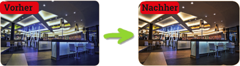 Vorher ist die Atmosphäre durch das Kunstlicht kalt und wenig einladend. Nach der Korrektur rechts sieht das schon ganz anders aus…