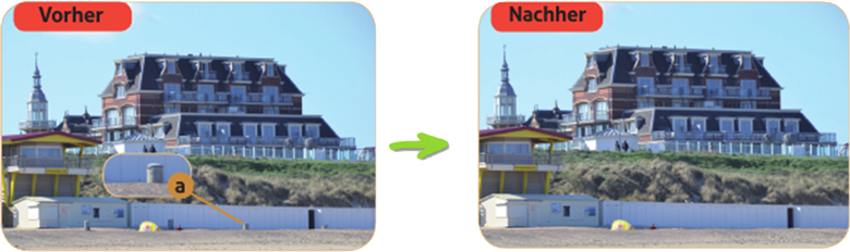 Mit einer Spezial-Funktion kopieren Sie einfach einen Bildbereich in der Nähe der Mülltonnen und „übermalen“ diese damit. Sie markieren einfach den Bereich, fahren kurz mit der Maus drüber – FERTIG!