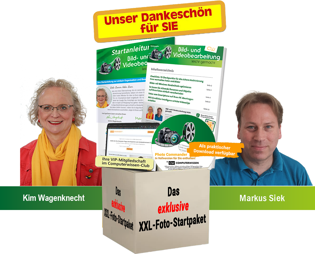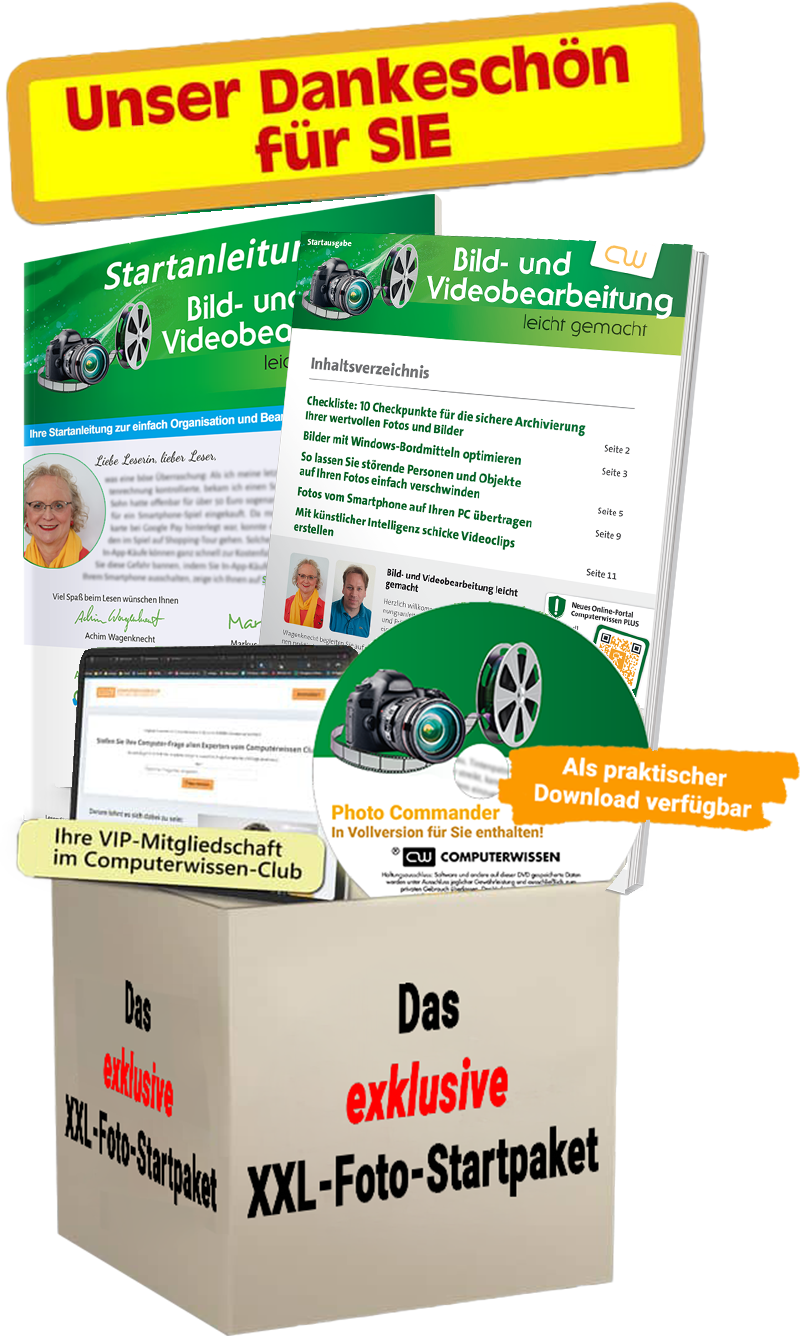 Davon können auch Sie jetzt profitieren, wenn Sie meiner Einladung folgen, „Bild- und Videobearbeitung leicht gemacht“ unverbindlich zu testen – und sich dafür risikolos das XXL-Foto-Startpaket als Geschenkprämie sichern.